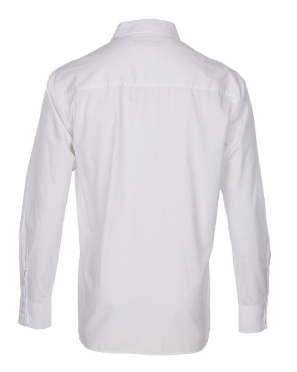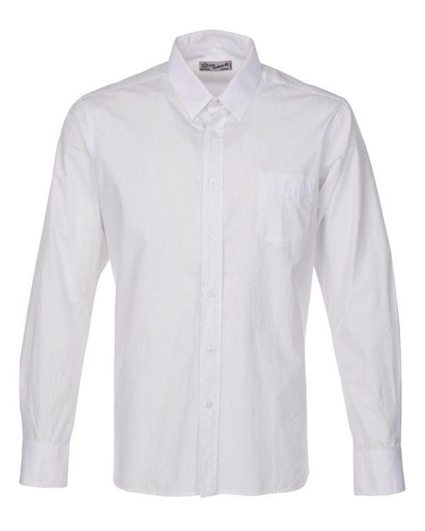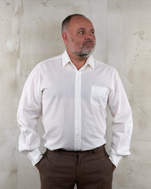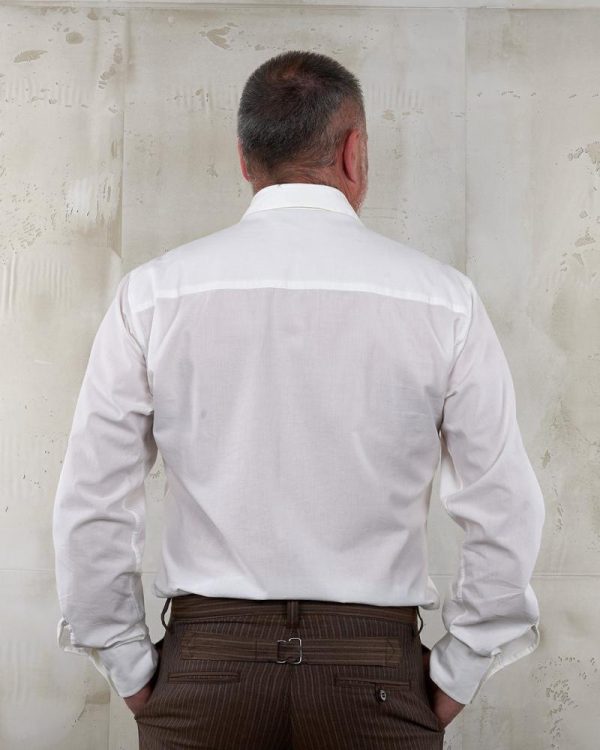 Klassisches Herrenhemd der späten 1940er Jahre. Das Hemd ist körperbetont geschnitten, hat einen kleinen Kragen und eine Brusttasche.