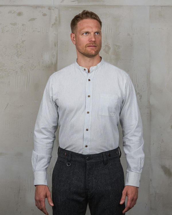 Unser 1923 Buccanoy Shirt ist die richtige Wahl, wenn es etwas gehobener sein soll. Was hat uns dazu inspiriert? Alle Hemden unserer 1923 Buccanoy Serie gehen auf ein historisches Vorbild aus den Zwanzigern zurück, das selbst auf eine noch viel ältere Tradition zurückblickt. Bereits seit Mitte des 19. Jahrhunderts setzte man in der Herrenmode bevorzugt auf Stehkragenhemden. Der Clou an der reduzierten Kragenform: Kurze Stehkrägen boten die Möglichkeit, einen weiteren eleganteren Kragen anzuknöpfen – zur damaligen Zeit am liebsten den sogenannten Vatermörder. Das abnehmbare Add-on gab dem Hemd nicht nur einen formelleren Charakter, es erleichterte auch das Reinigen und Stärken des Kragenteils, der stärker in Mitleidenschaft gezogen und schneller dreckig wurde. Bis in die 1940er erfreute sich diese Art von Hemden großer Beliebtheit, bis sie mehr und mehr von den bis heute weit verbreiteten Modellen mit Umlegekragen, die fest mit dem Hemd verarbeitet werden, verdrängt wurde.