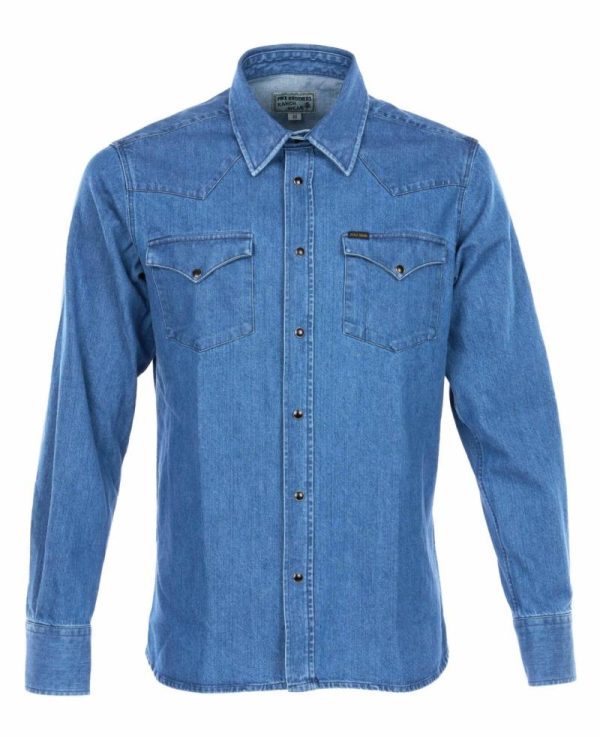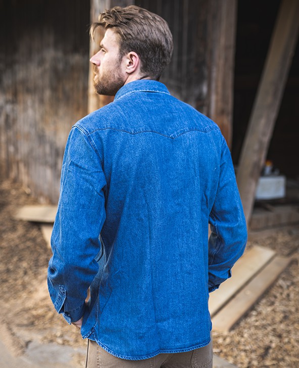 Unser 1952 Rider Shirt in einer Waschung. Der Schnitt ist typisch für ein Western Arbeitshemd der 1950er Jahre mit den für Westernhemden klassischen details wie den Abnähern auf der Schulter und den geschwungenen Taschenklappen.