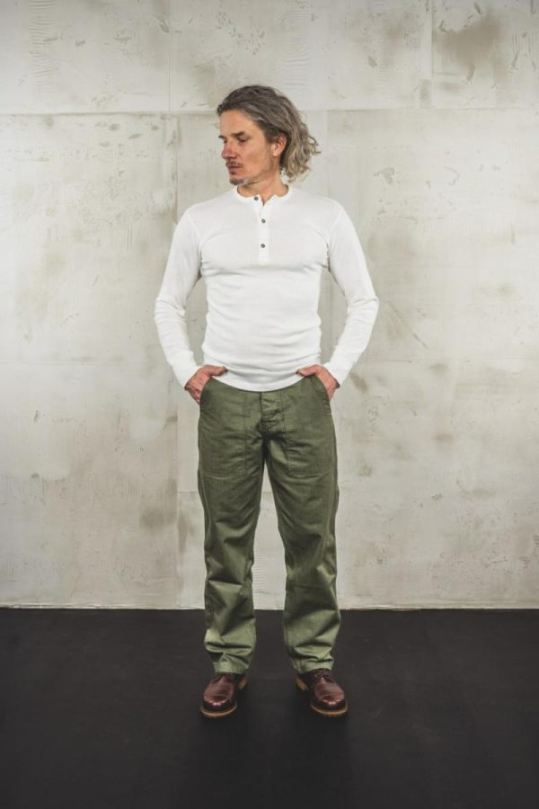 Es ist dünner als unser 1954 Utility Shirt und innen nicht gerauht. Daher ist es leichter auf der Haut und kühler. Ideal also, um es unter einem Hemd zu tragen oder im Sommer als einzige Lage.
