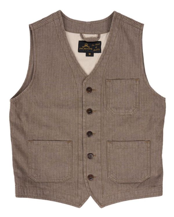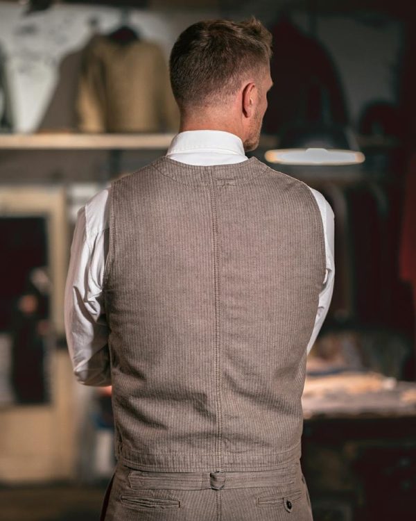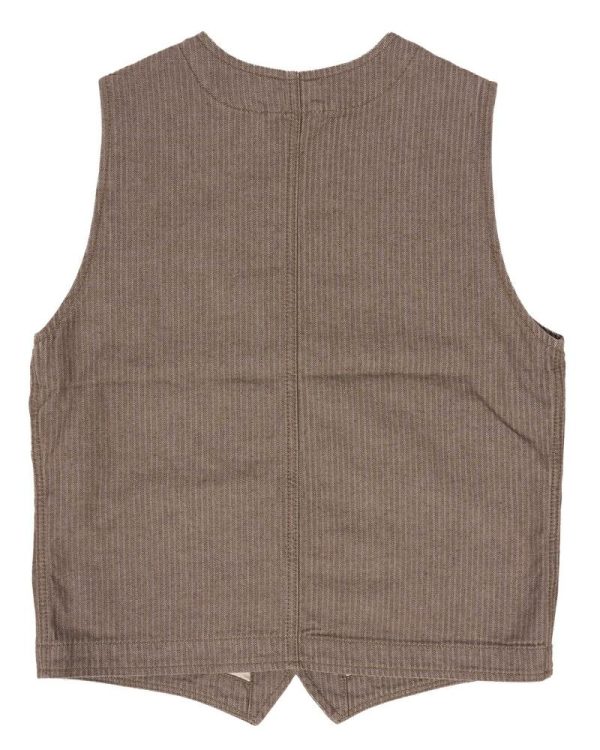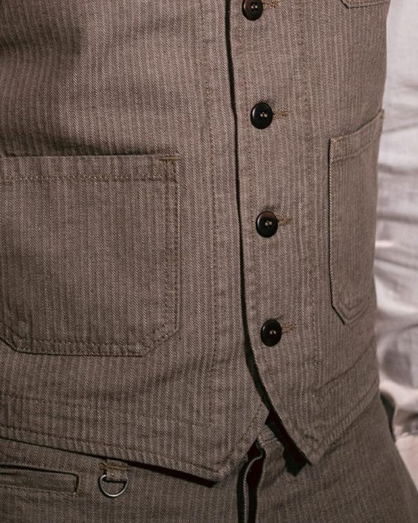Die 1937 Roamer Vest HBT brown ist aus einem Herringbone Stoff mit Webkante gefertigt. Die Web- oder Selvage Kante ist Qualitätsmerkmal für einen alten Schützenwebstuhl. Unseren Selvage HBT lassen wir nach alter Rezeptur fertigen.